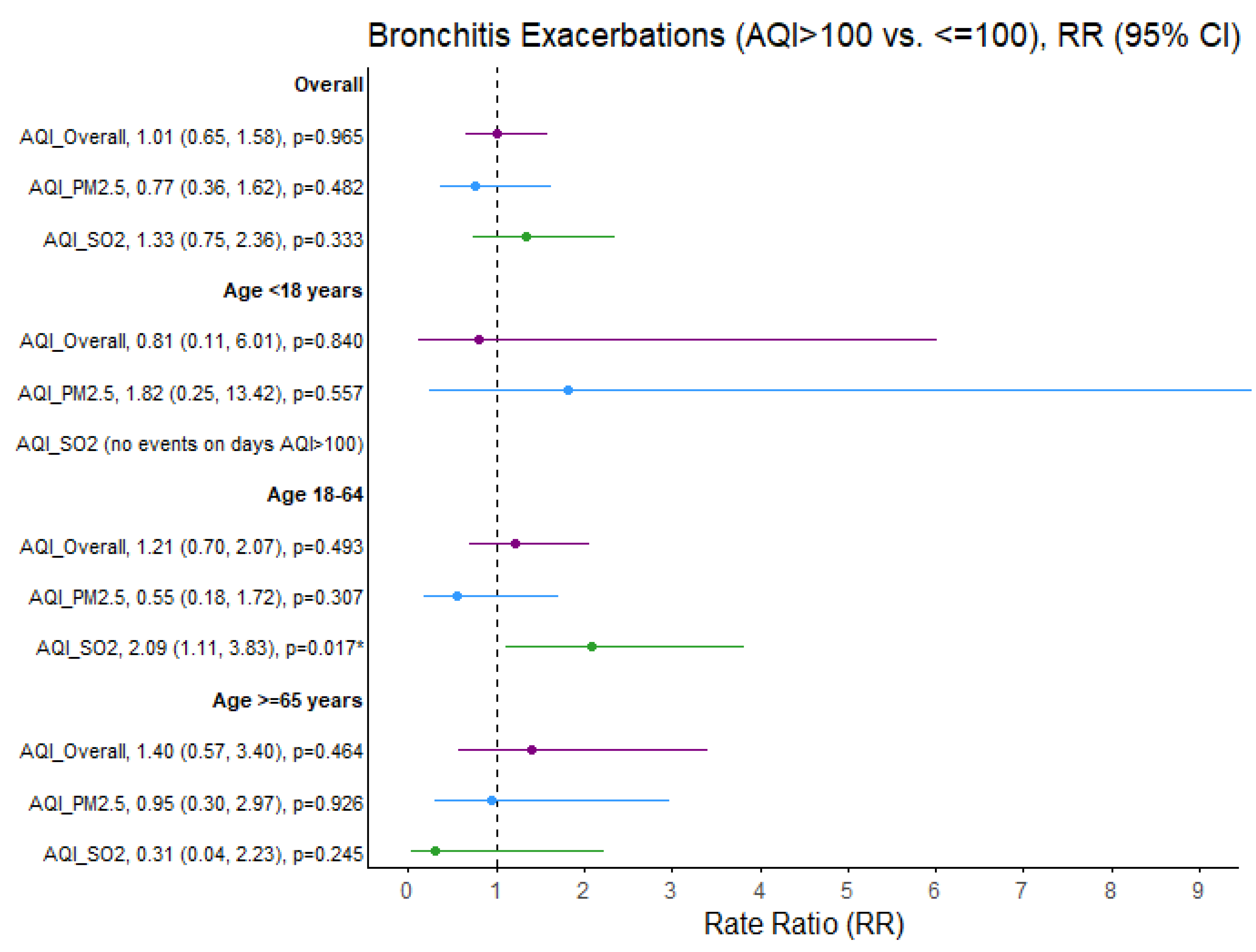Figure 3. Bronchitis exacerbation rate ratios (RRs) comparing air quality days (AQI > 100 vs. ≤100) overall and specific to PM2.5 and SO2 pollutants. * p < 0.05, exacerbation rate ratios (95% CI) estimates and significance based on GLM Poisson regression. Ozone and NO2 not presented due to limited days when AQI > 100 (N = 6 and N = 0 days, respectively). Purple = Overall AQI (>100 vs. ≤100), Blue = PM2.5 AQI (>100 vs. ≤100), Green = SO2 AQI (>100 vs. ≤100).