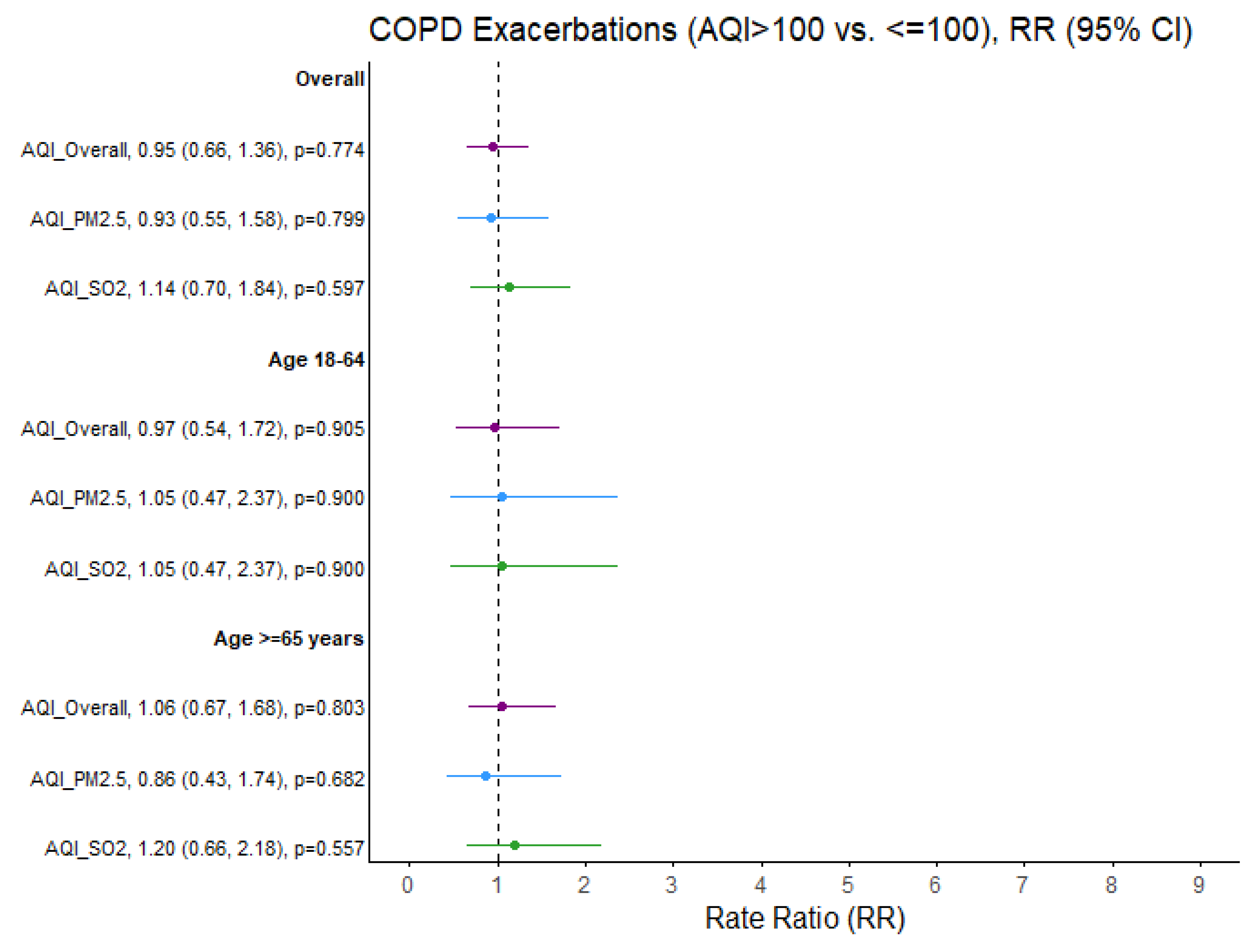 Figure 4. COPD exacerbation rate ratios (RRs) comparing air quality days (AQI > 100 vs. ≤100) overall and specific to PM2.5 and SO2 pollutants. Ozone and NO2 not presented due to limited days when AQI > 100 (N = 6 and N = 0 days, respectively). Purple = Overall AQI (>100 vs. ≤100), Blue = PM2.5 AQI (>100 vs. ≤100), Green = SO2 AQI (>100 vs. ≤100).
