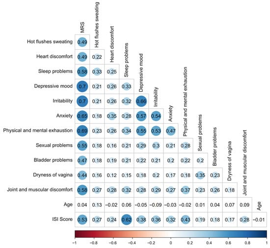 Among 4058 women who completed the ISI, the average score was 14.16 (SD 4.87). Only 9.7% of participants reported no insomnia, while moderate to severe insomnia affected 48.3% of this subsample. Correlational analyses revealed that ISI scores were associated with multiple MRS domains, particularly psychological and somato-vegetative symptoms (Figure 1, Table 2 and Figure 2).