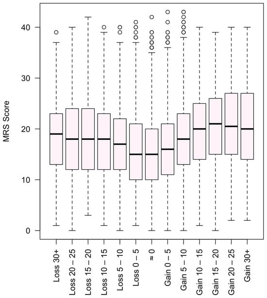 In a subsample of 1606 women with employment data, unemployed women had significantly higher MRS (mean 20.5 vs. 16.8–17.9) and ISI scores (mean 16.3 vs. 13.9–14.3) compared to employed peers (p < 0.001). Additionally, 54% of respondents reported weight gain in recent years, and this group showed a trend toward higher symptom scores, underscoring a potential link between perceived body changes and menopausal distress. Furthermore, weight gain and weight loss were considered together with the MRS II. As can be seen in Figure 3, there are patterns indicating that weight stability is associated with a lower MRS II.