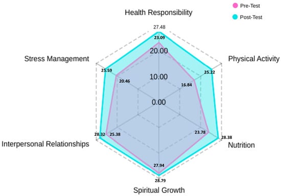 The pre-test results showed initial values ranging from 16.8 to 27.94. The physical activity dimension had the lowest average, while spiritual growth had the highest average. In the post-test, the results show an overall average ranging from 25.22 to 28.79. Although the physical activity dimension had the lowest proportion in this evaluation, the interventions were effective, reflecting an 8.38 increase in results. In general terms, there is an average increase of 0.85 to 8.38 in the specific dimensions: health responsibility (4.39), physical activity (8.38), nutrition (4.6), spiritual growth (0.85), interpersonal relationships (2.94), and stress management (5.13). (See