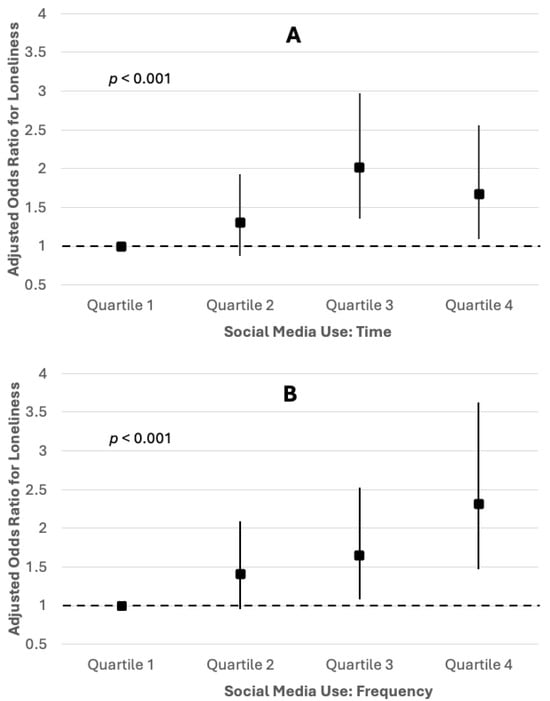 These figures represent odds ratios and 95% confidence intervals for loneliness based on social media use among U.S. adults ages 30–70. Independent variables were time of social media use (A) and frequency of social media use (B). In terms of time, social media use in hours per week was 0–7 h for quartile 1, 8–20 h for quartile 2, 21–41 h for quartile 3, and 42 or more hours for quartile 4. In terms of frequency, social media use in checks per day was 0–4 h for quartile 1, 5–11 h for quartile 2, 12–21 h for quartile 3, and 22 or more for quartile 4. p-values represent linear effect according to the Cochrane–Armitage test.