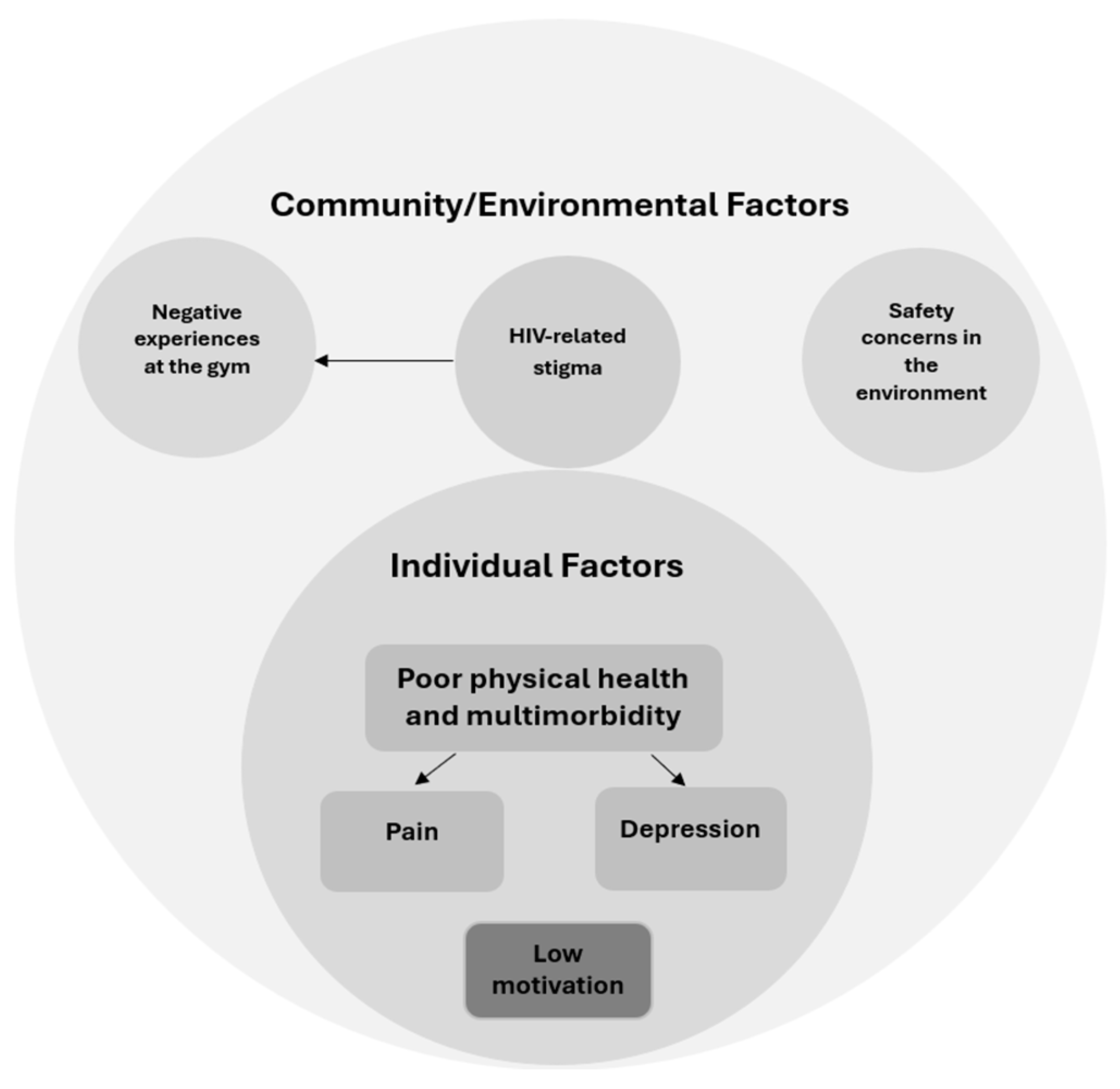 - Song, D.; Hightow-Weidman, L.; Yang, Y.; Wang, J. Barriers and Facilitators of Physical Activity in People Living with HIV: A Systematic Review of Qualitative Studies. J. Int. Assoc. Provid. AIDS Care 2024, 23, 23259582241275819. Available online: https://scholar.google.com/scholar_url?url=https://journals.sagepub.com/doi/pdf/10.1177/23259582241275819&hl=en&sa=T&oi=ucasa&ct=ufr&ei=pNhZaPXTMsy8ieoPt5yl6Qk&scisig=AAZF9b-rRGvGG0xvNX_EvJEHSyuv (accessed on 24 June 2025). [CrossRef] [PubMed]
