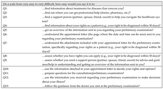 The survey was specifically designed for this pilot study. We developed a 13-item health literacy questionnaire specifically targeting comprehension of appointment letter content and patient rights, structured around four domains (assessing, understanding, appraising, and applying) derived from the Sørensen et al. health literacy framework (see Figure 1; for the Danish version see Figure S1 in the Supplementary Material S2). Each domain’s items were designed to reflect a stage in processing written health information. For instance, the assessing domain (4 items) asked how easily a patient could find and identify important details in the letter; the understanding domain (3 items) gauged how easily the patient understands the content; appraising (2 items) covered judging the trustworthiness or relevance of the information (including legal rights); and applying (4 items) addressed using the information in one’s healthcare decisions. The four questions designed to assess the patients’ ability to apply information were structured such that two questions focused on the informational material provided before the preliminary examination. In comparison, the remaining two questions addressed the application of information after the initial examination.