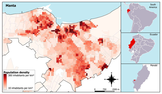 The city of Manta is located on Ecuador’s central coast (Figure 1), with an approximate population of 261,871 inhabitants [5]. It is one of the main urban centers in the province of Manabí and a significant maritime hub in the country. Manta has a subtropical to maritime temperate climate, with average annual temperatures ranging between 21 °C and 28 °C, and a climatic pattern characterized by a rainy season from January to June and a dry season from July to December. The city features diverse infrastructure, including high-density urban sectors and marginalized neighborhoods with limited access to basic services.
