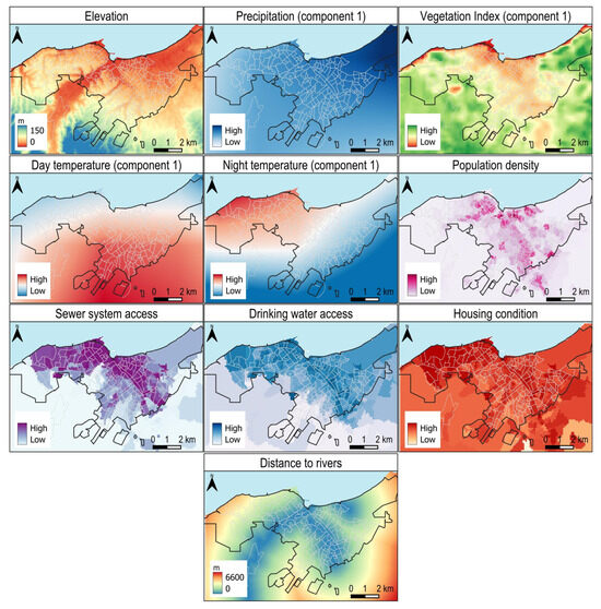 Variables used in the Maxent model to estimate suitability for dengue transmission. These include elevation, first principal component of precipitation, first principal component of vegetation index, first principal component of day temperature, first principal component of night temperature, population density, access to sewer system, access to drinking water, housing condition, and distance to rivers. These variables were selected as potential environmental and socio-economic drivers influencing the spatial distribution of dengue risk. The input values of all variables summarized by neighborhood are provided in Supplementary Materials (File S1).