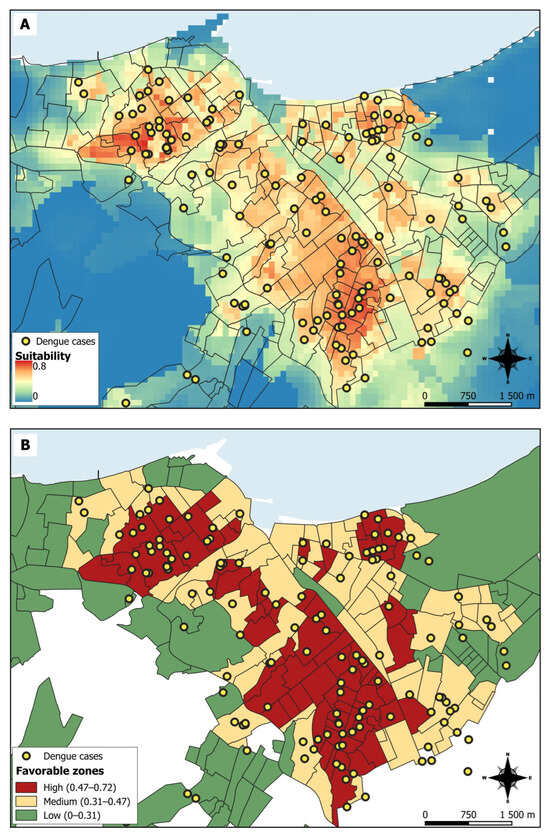 According to the risk thresholds (favorable zones), most neighborhoods in Manta fall within the high to medium risk levels, while peripheral areas of the city show low risk. The highest probability of disease presence was in neighborhoods in the south and northwest of Manta, and some neighborhoods in the northeast (Figure 3B).