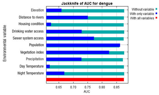 Jackknife test results of regularized gain for the respective explanatory variables used in the Maxent habitat model for dengue transmission.