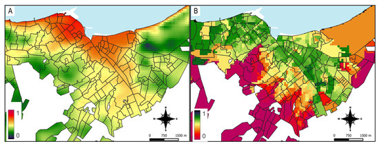 The climatic zoning shows that the index is high in the coastal area (less rainfall and vegetation), indicating that it would be less favorable for the mosquito and therefore for dengue transmission (Figure 5A). The social zoning in the city of Manta seems to reinforce the climatic zoning, since the areas with better social conditions (higher values) are in the coastal strip and in the urban area of the city. Conversely, areas with higher social vulnerability (lower values) are concentrated in the south and south-east or in peri-urban areas (Figure 5B).