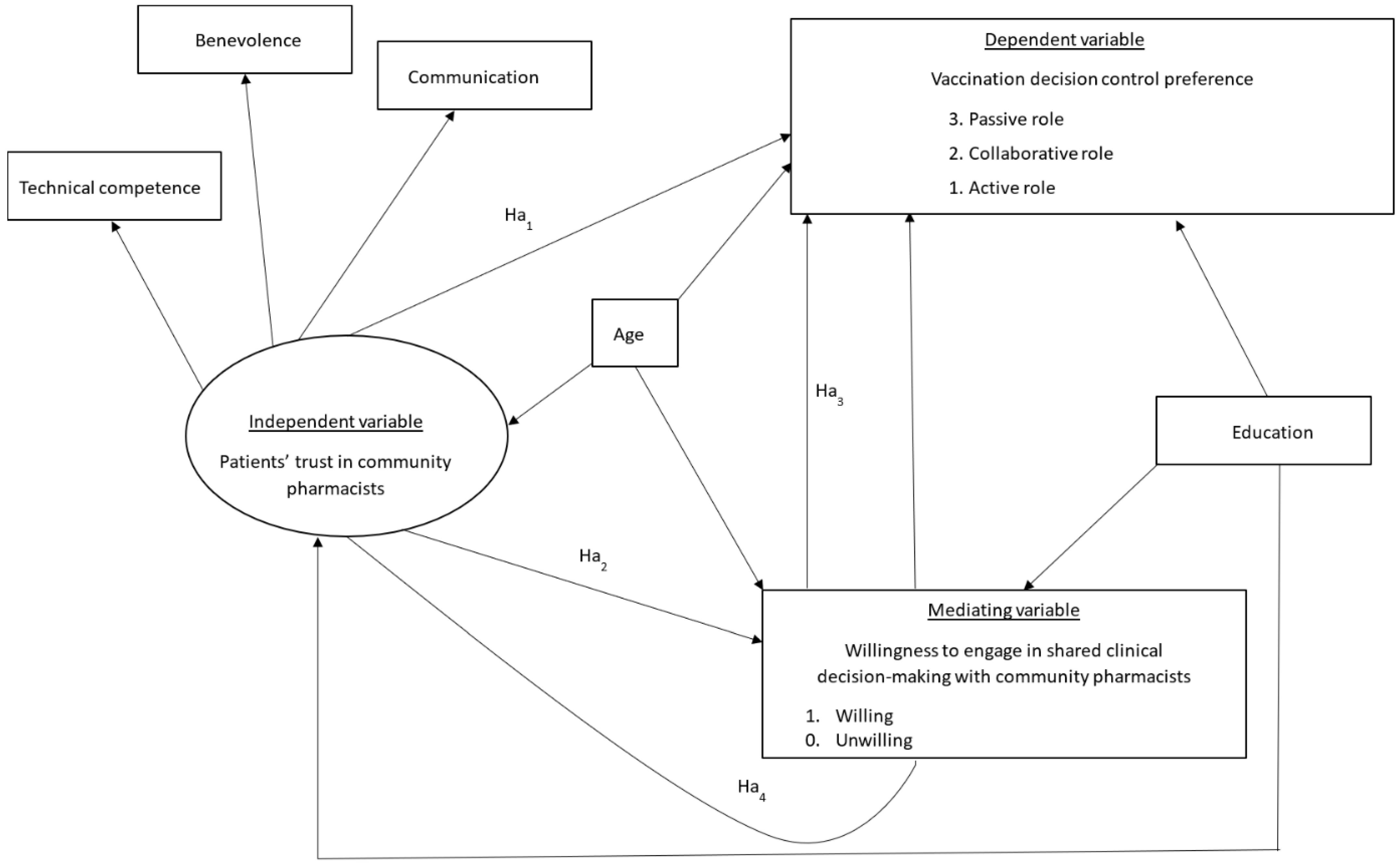 Direct effect of patient’s trust in community pharmacists on vaccination decision control preference | Ha1 | 0.23 (0.09, 0.37) | 0.07 | 0.001 |