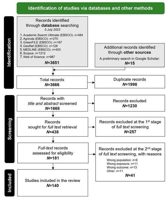 A total of 3666 records were identified. After 1998 duplicates were removed, 1668 unique records were screened for titles and abstracts. Of these, 1230 records were excluded, and 438 were sought for full-text retrieval and reviewed in two stages. After consulting the full text for details during the first stage, we reviewed the studies initially marked as “Maybe” and “Included” in Rayyan, and 257 were excluded. During the second stage, we reassessed the remaining 181 records for eligibility, resulting in the exclusion of 41 studies [40,41,42,43,44,45,46,47,48,49,50,51,52,53,54,55,56,57,58,59,60,61,62,63,64,65,66,67,68,69,70,71,72,73,74,75,76,77,78,79,80] (Supplementary Material S2). Following the reassessment process, we identified 140 studies [22,23,25,26,27,28,29,30,33,34,35,36,81,82,83,84,85,86,87,88,89,90,91,92,93,94,95,96,97,98,99,100,101,102,103,104,105,106,107,108,109,110,111,112,113,114,115,116,117,118,119,120,121,122,123,124,125,126,127,128,129,130,131,132,133,134,135,136,137,138,139,140,141,142,143,144,145,146,147,148,149,150,151,152,153,154,155,156,157,158,159,160,161,162,163,164,165,166,167,168,169,170,171,172,173,174,175,176,177,178,179,180,181,182,183,184,185,186,187,188,189,190,191,192,193,194,195,196,197,198,199,200,201,202,203,204,205,206,207,208] that met the eligibility criteria and were subsequently included in this review (Supplementary Material S3).