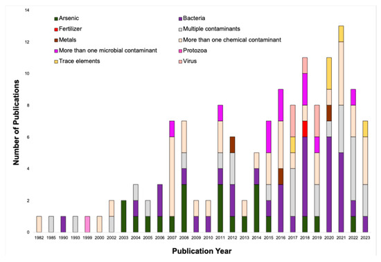 In the studies that focused on irrigation waters, arsenic (n = 2, 20%) [98,99], bacteria (n = 1) [34] and viruses (n = 1) [185] were reported as the major contaminants. Of the 45 studies that did not specify the use of water that was being tested, three (6.67%) identified metal contamination [174,191,198] (Figure 4).