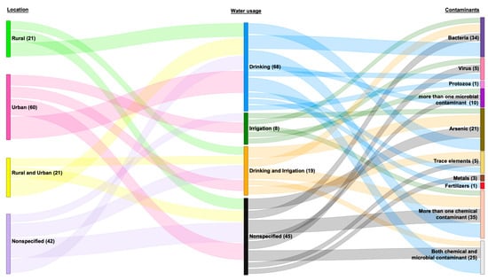 The organizational structure of this review article is based on three key categories: location (urban, rural, both, and non-specified), water sources (groundwater, surface water, and multiple other sources), and water usage (drinking, irrigation, both, and non-specified). This approach not only allowed for a more streamlined and systematic evaluation of the literature but also enabled us to address additional questions—for instance, how many studies investigated both irrigation and drinking water, or how many drew samples from multiple provinces. It is also worth noting that among microbial contaminants, some studies focused on identifying total coliforms, fecal coliforms, and/or Escherichia coli (E. coli). E. coli is a subset of fecal coliforms, which in turn are a subset of total coliforms. To maintain consistency with the original literature, the terminology used in each original study has been preserved without modification.