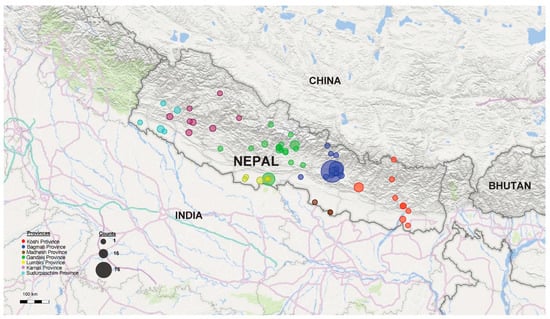 A map representing the number of studies identified from the seven provinces of Nepal. The colors represent the seven different provinces, and the circle size represents the number of studies evaluating water samples from a location in each province.