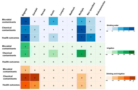 The following data were extracted: record identifiers (e.g., objectives, methodology, sample size, Nepal region), water usage (drinking, irrigation, spring, river, well, etc.), water source (surface, wastewater, spring, river, well, glacier, rainfall, lake, pond, groundwater, harvested rainwater, etc.), type of contamination (microbial—bacteria, virus, protozoa, algae; and chemical—pesticides, metals, fertilizers), assessment of water quality, location (urban, rural, semi-urban), health outcomes, key findings, and recommendations.