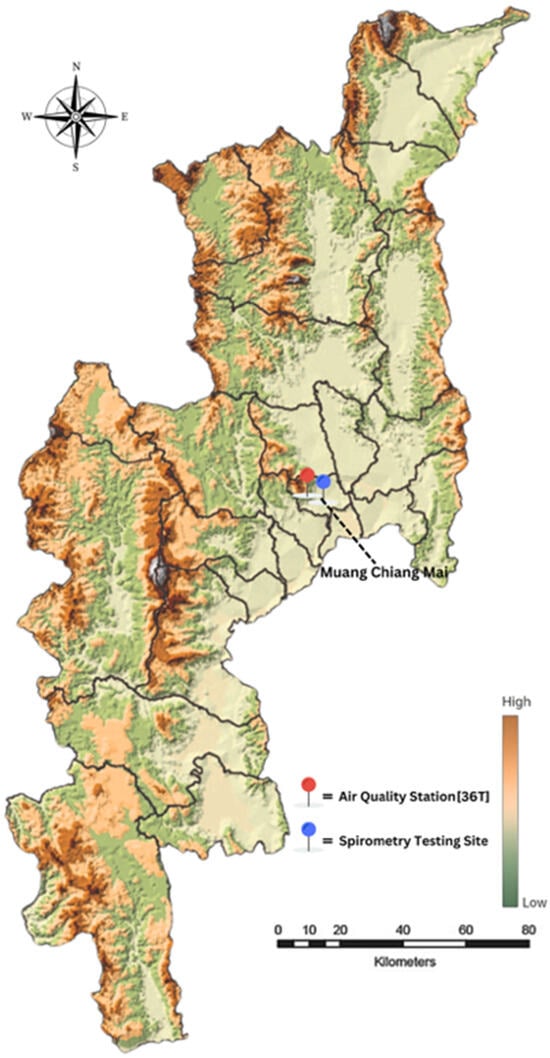This study was conducted in Chiang Mai Province, northern Thailand, an area predominantly characterized by mountainous terrain. Figure 1 illustrates the study area and monitoring site in Chiang Mai Province, Thailand. The background color gradient indicates relative elevation, with darker brown shades representing higher topography. The red marker denotes the air quality monitoring station (36T), located at Yupparaj Wittayalai School, while the blue marker indicates the spirometry testing site at Wat Chiang Yuen Municipal School. Both selected locations are situated in Mueang Chiang Mai District and are within a 2-km radius of each other. Participants included primary school students aged 8–12 years, who underwent pulmonary function testing using spirometry. A total of 110 students were randomly selected across all grade levels. The spirometry tests were conducted in July 2024, when ambient PM2.5 levels in Chiang Mai are typically low, to ensure the availability of volunteers and their optimal physical condition. By that time, participants were more likely to have recovered from seasonal respiratory illnesses, such as influenza or colds caused by dry air, which typically occurred during the early months of the year [17,18]. Since spirometry testing required participants to be free from symptoms such as coughing, sneezing, or a runny nose, the presence of these symptoms could have resulted in inaccurate measurements and failure to meet standard procedural guidelines [19]. Additionally, July was selected during the school semester when students were present and accessible, reducing both practical and ethical concerns. Conducting tests during the peak pollution months (March–April) would have posed ethical challenges, as children might have already experienced respiratory symptoms, and testing could have increased discomfort or exacerbated existing conditions. Furthermore, conducting the tests during the low-exposure season minimized acute confounding effects from active pollution events and provided a clearer baseline of lung function that may have reflected underlying chronic or residual impairments. Although this timing limited the direct observation of acute exposure effects, previous studies [20] suggested that repeated seasonal exposure to air pollution could have contributed to chronic or subacute respiratory impacts detectable beyond the exposure period. Given that children in Chiang Mai were repeatedly exposed to high levels of PM2.5 on an annual basis, the lung function results collected in July might have reflected cumulative or residual effects, even in the absence of acute pollution during the testing period. Therefore, the findings in this study should be interpreted as inferences of cumulative and/or residual exposure rather than acute effects. The lung function impairments observed were likely shaped by prior repeated exposures to elevated PM2.5 levels during previous haze seasons, not by pollution occurring on or near the day of spirometry testing.