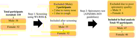 Of the 110 initial research participants, 17 were excluded for various reasons: 3 due to acute respiratory symptoms, and 14 because their spirometry tests did not meet the within-test variability threshold (≤150 mL difference between the best two FVC and FEV1 values), as specified by the 2019 ATS/ERS guidelines [26]. As a result, 93 participants (47 males, 50.54% and 46 females, 49.46%), aged 8–12 years, successfully completed the study, as presented in Figure 3. The average body weight of participants was approximately 40 kg, with a mean height of 143 cm and an average chest circumference of 70.4 cm. All participants were residents of Chiang Mai Province. The physical characteristics of these participants are summarized in Table 4.