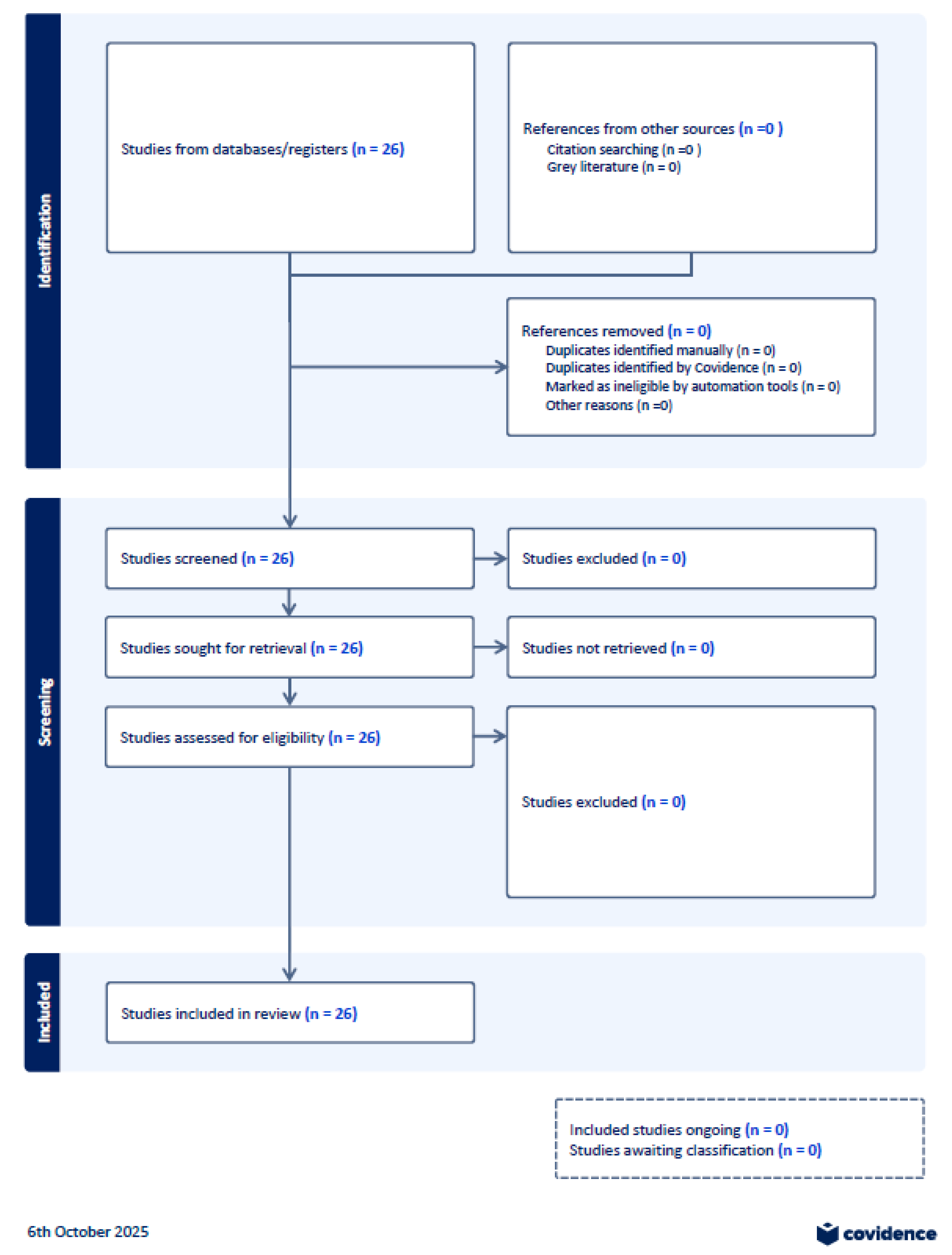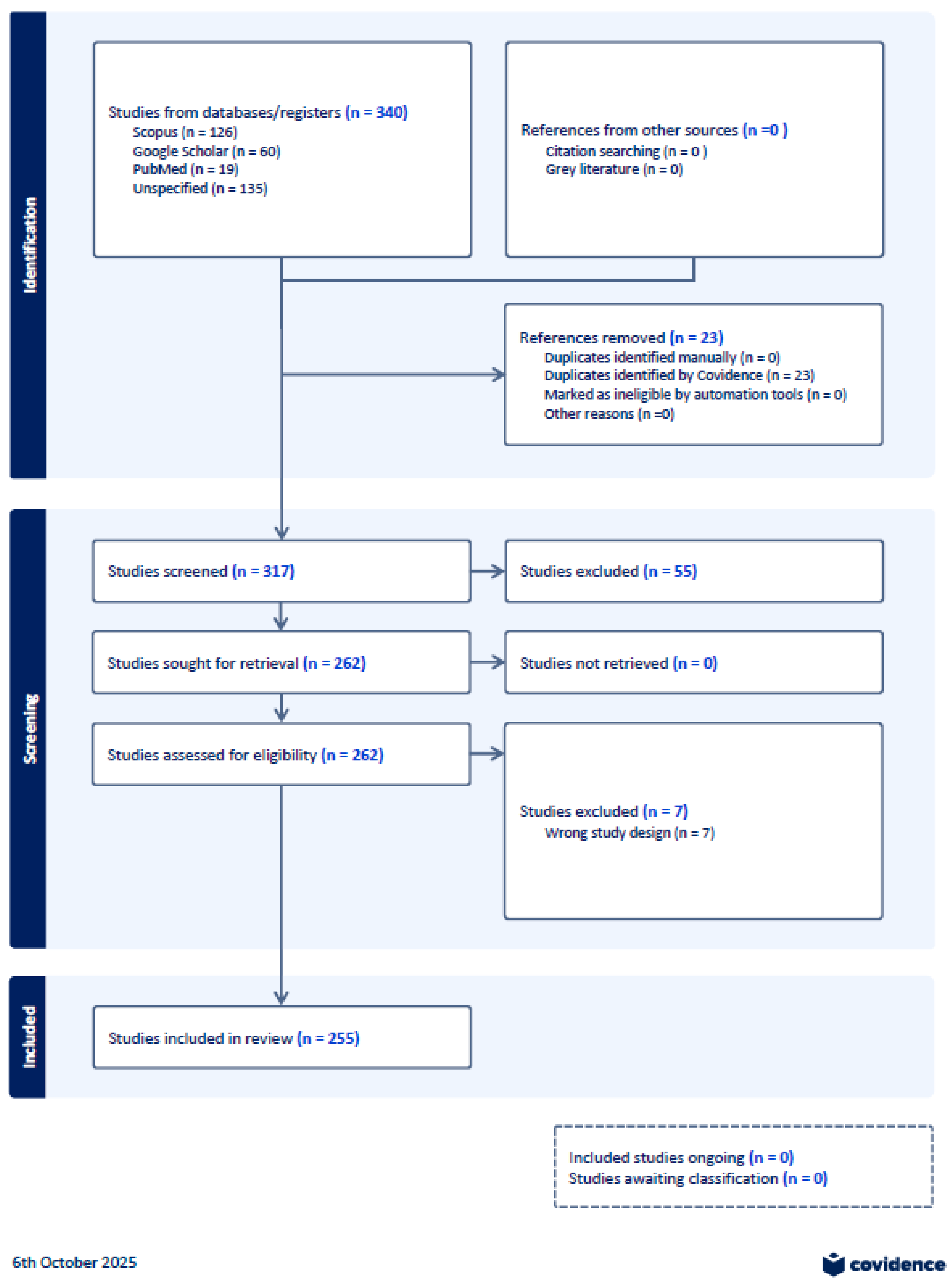 - Full dataset: 255 studies (2006–2025); Sample: 26 (2019–2025).