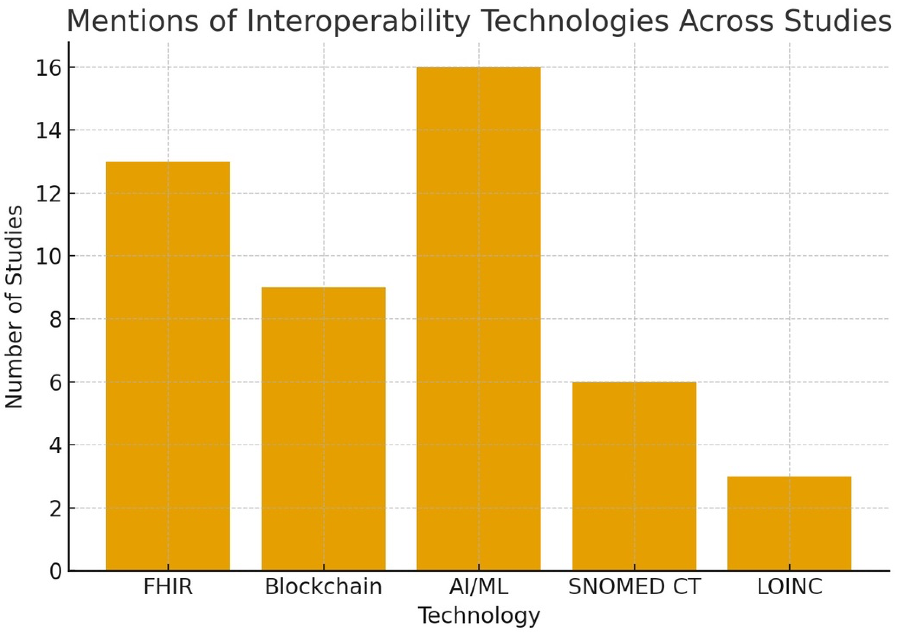 - Emerging technologies: Which new technologies (e.g., AI, blockchain, IoT, federated learning) are being integrated to support digital health interoperability?