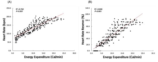 Figure 1 illustrates the relationships between HR, HRres, and measurements of EE. Both HR and HRres exhibited strong positive correlations with measurements of EE, with HRres showing a slightly higher correlation coefficient (R2 = 0.800) compared to HR (R2 = 0.782) (Figure 1).