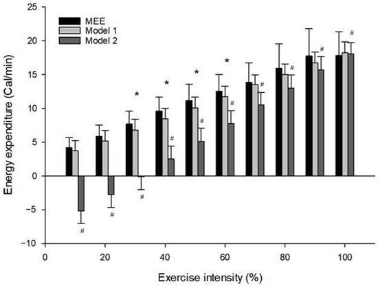 Incremental Exercise Intensity: Comparison of Measured and Predicted Energy Expenditure. * Significantly different from Measured EE. # Significantly different from MEE. MEE—measured energy expenditure.
