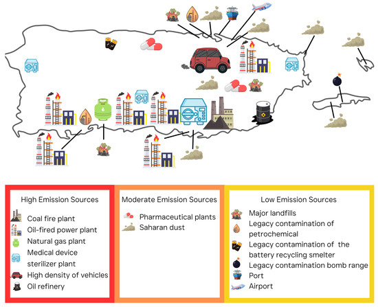 Geographic distribution and qualitative contribution of major air pollution sources across (PR). This schematic aims to visually communicate relative air pollution burdens across the island, grounded in measured or modeled concentrations and risk metrics. The figure was generated based on midpoint air pollutant concentrations (μg/m3) reported in Table 2, using available monitoring data from 2015 to 2023. Icons are scaled proportionally to reflect the relative magnitude of emission, with larger icons representing higher estimated regional contributions. These include power generation facilities (coal, oil, and natural gas), medical device sterilizer plants emitting HAPs like EtO, and pharmaceutical manufacturing centers [9,19,27,31,32]. The San Juan metropolitan area is marked by high vehicle density, port, and airport activity, contributing to air pollution [10,19]. The south region (Guayama–Peñuelas) continues to host the island’s largest fossil fuel infrastructure. Legacy contamination sites—such as a petrochemical complex in the south, a former battery smelter in the north, and a former military bombing range in Vieques—pose ongoing environmental health risks [8,9,10,11,16,34,35]. Poorly managed major landfills also contribute various HAPs.