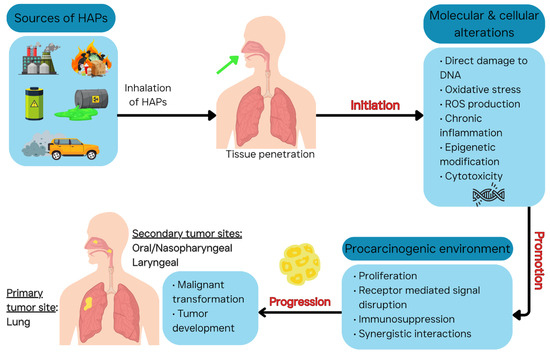 Air pollution is a major global environmental health risk for morbidity and mortality, contributing substantially to the burden of chronic diseases, including cancer. According to the State of Global Air, air pollution was associated to 8.1 million deaths worldwide in 2021 [1], ranking it as the second most significant risk factor for premature death globally [1]. Previously, the World Health Organization (WHO) indicated that ambient (outdoor) air pollution was associated to approximately 4.2 million premature deaths globally in 2019, with a significant proportion attributed to noncommunicable diseases such as lung cancer, cardiovascular diseases, and chronic respiratory conditions [2]. Outdoor air pollution, particularly particulate matter (PM)2.5, was officially classified as carcinogenic to humans (Group 1) by the International Agency for Research on Cancer (IARC) in 2013 [3], with sufficient evidence linking exposure to increased lung cancer risk and limited evidence for other types [4]. Emerging evidence suggests that air pollution may play a significant role in driving lung cancer in non-smokers, highlighting the need for stronger environmental health protections [5,6]. These findings highlight the critical importance of understanding the components of air pollution that contribute to its carcinogenicity.