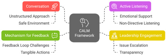 The CALM framework, developed based on these findings, aims to foster a supportive environment where healthcare workers feel heard, valued and supported. The conversational and active listening components were especially effective in building trust and emotional connection. Leadership engagement proved vital in facilitating communication and escalating concerns, but challenges remained in ensuring feedback led to visible, actionable changes. The CALM framework offers valuable insights into refining future wellness rounding practices. Figure 2 shows the conceptual diagram of the CALM framework, contextualizing the findings within the broader framework by highlighting the relationships between the four components and their role in enhancing wellness rounding.