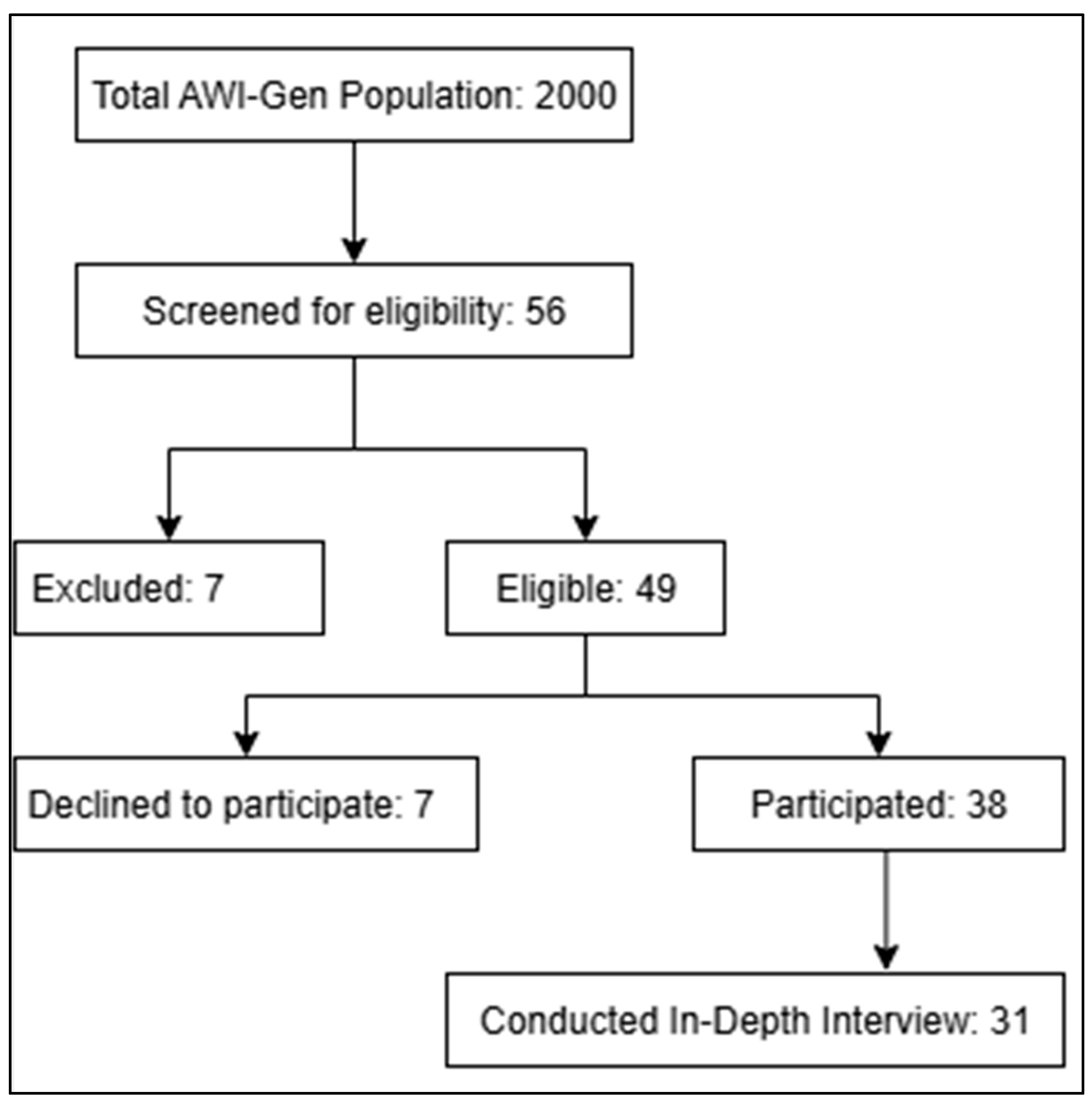 Data was collected through qualitative face-to-face in-depth interviews using an interview guide. Data was collected during the AWI-Gen 2 research findings feedback session held in the Dikgale area. The Dikgale area forms part of villages that fall under the Dikgale Mamabolo Mothiba Population Health Research Centre (DIMAMO PHRC) surveillance area. The DIMAMO site is located in rural areas about 30 km north of Polokwane, Limpopo province, South Africa (Figure 1) [23]. All participants were of low socio-economic status, and this has been reported elsewhere [24,25]. However, in summary, most participants in the AWI-Gen study where unemployed and had low educational attainment [24,25]. The following criteria were employed to recruit the participants: participants who took part in the AWI-Gen 2 study, and male or female aged 40 years or above. Those who did not participate in AWI-Gen 2, were under the age of 40 years, or did not consent to participate in the study were excluded (Figure 2). The Africa Wits INDEPTH Partnership for Genomic Research (AWI-Gen) is a population cohort that was initiated in 2012. The main goal of AWI-Gen is to investigate how genes, environment, and lifestyle affect cardiovascular and metabolic health across Africa and to uncover new insights that could help to improve the health of Africans [26]. To capture a wide range of perspectives relating to the impact of research results on the lived experiences of study participants, a heterogeneous sampling method was used. Heterogeneous sampling is a purposive sampling technique used to capture a wide range of perspectives relating to the topic that one is interested in studying. This technique seeks to search for variations in perspectives, ranging from conditions that are viewed to be typical to those that are extreme.