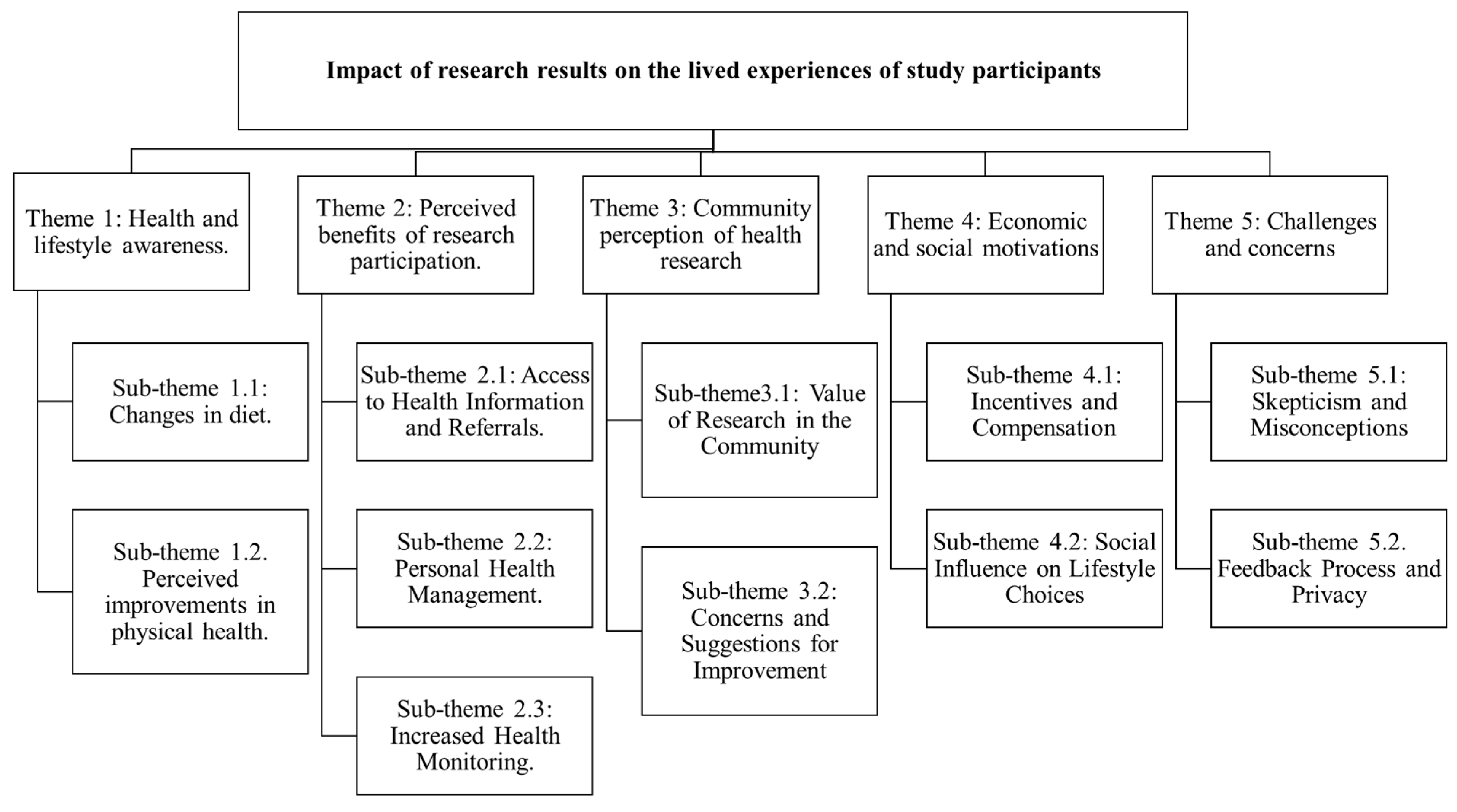 The present study included 31 individuals, of whom 79% were women and 29% were men. All participants were 40 years and older; this is represented in Table S1 (see Supplementary Materials S1), which shows the sociodemographic characteristics of the included participants. The results section below is organized around themes of the perceptions of participants relating to the impact of research results feedback on the lived experiences of study participants. These themes, identified through deductive analysis, include health and lifestyle awareness, perceived benefits of research participation, community perception of health research, economic and social motivations, and challenges and concerns. These themes and their sub-themes are represented schematically in Figure 3.