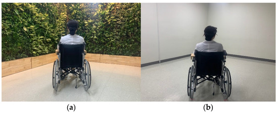 Two indoor spaces in a hospital were prepared. One was a control setting with plain white wall, and the other was a naturalized space with biophilic design where the walls were entirely covered with vegetation, providing a total green area of 21 m2 (Figure 1). The design was intentionally simplified to ensure a clearer interpretation and stronger internal validity of the results. In the biophilic space, 10 species of foliage plants were cultivated in individual pots and arranged to uniformly cover the wall surface, allowing the space to be visually perceived as a continuous biophilic area (Table 1). The control condition was established in a monotonous white wall with the same flooring material as the biophilic space. All experimental settings were cleared of all furniture and decorative elements. To minimize the influence of external environmental variables, experiments were conducted under controlled conditions. Temperature, humidity, and illuminance were maintained at 25.9 ± 0.6 °C, 61.5 ± 4.3%, and 373.0 ± 61.1 lx, respectively, in both the biophilic space and the control conditions.