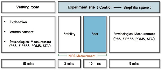 Each condition involved 10 min of exposure to the assigned environment (biophilic space vs. control), corresponding to the typical break duration in medical settings. During this period, participants remained seated and rested with their eyes open. The 10-min timeframe was determined based on empirical and practical considerations. Previous studies have demonstrated that short-term breaks can alleviate job stress among hospital nurses through psychological detachment [48], and that exposure to natural environments for at least 10 min can yield measurable improvements in mental health and cognitive functioning [19,49]. Also, in Korea, the minimum duration of a single rest break in workplace is generally at least 10 min. Therefore, a 10-min exposure period was adopted in this study to reflect a realistic and evidence-based rest duration for evaluating the short-term restorative effects of biophilic environments in workplace settings. To reduce residual physiological effects between conditions, a 3-min stabilization period was implemented before switching environments. After each session, the participants completed self-report questionnaires to assess their psychological responses to exposure to different conditions. The order of conditions was randomized to eliminate potential order effects, and all participants completed one of the measurements in both the biophilic space and the control conditions.