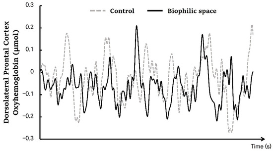 The findings demonstrated that exposure to the biophilic condition significantly reduced oxyhemoglobin (oxy-Hb) concentrations in the DLPFC compared with the control condition. The DLPFC serves as a critical hub for executive functions, such as decision-making, attentional regulation, and emotional integration [40]. Activation of the DLPFC is often elevated in response to strong negative emotions or an increased emotional load [35]. It also mediates top-down regulation within the prefrontal–amygdala network, suppressing negative affect while enhancing positive emotion. The observed reduction in DLPFC activation in this study reflects a shift toward functional efficiency, indicating relief from cognitive–emotional overload [58].