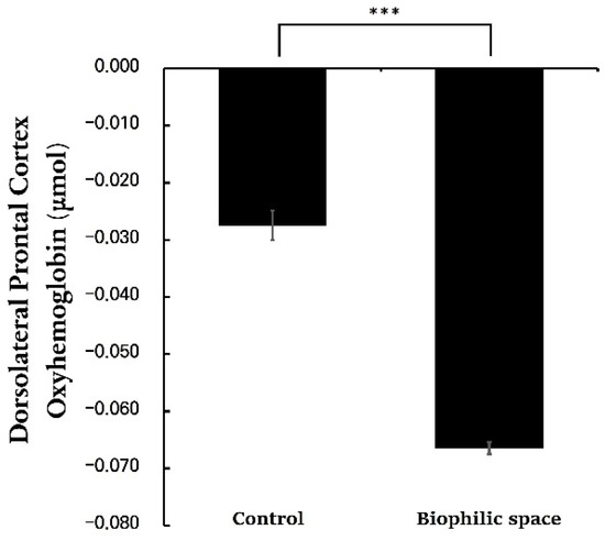 Mean oxyhemoglobin (oxy-Hb) concentrations in the dorsolateral prefrontal cortex (DLPFC) during the 10-min rest period under the control and biophilic conditions. N = 21; *** p < 0.001; Paired t-test.