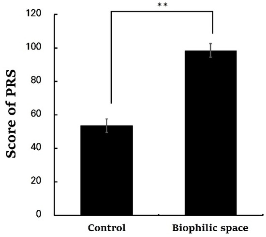 Total Perceived Restorativeness Scale (PRS) scores under the control and biophilic conditions. N = 21; ** p < 0.01; Wilcoxon signed-rank test.