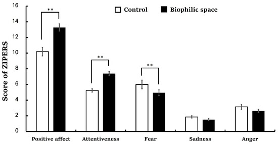 Subscale scores of the Zuckerman Inventory of Personal Reactions Scale (ZIPERS) under the control and biophilic conditions. N = 21; ** p < 0.01; Wilcoxon signed-rank test.