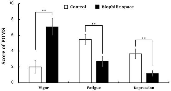 Profile of Mood States (POMS) scores under the control and biophilic conditions. N = 21; ** p < 0.01; Wilcoxon signed-rank test.