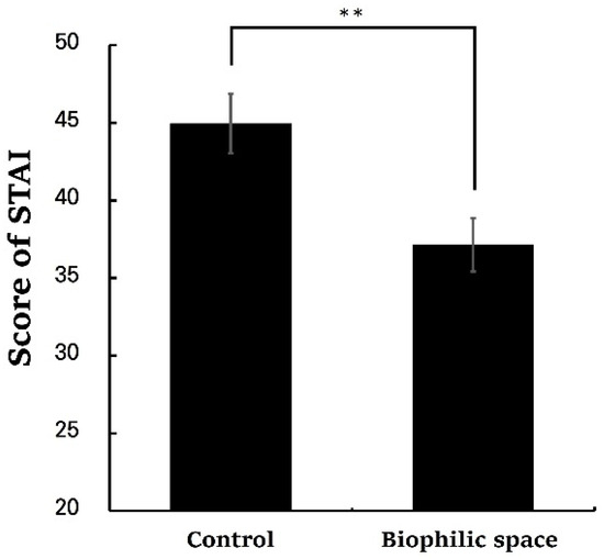 Total State–Trait Anxiety Inventory (STAI) scores under the control and biophilic conditions. N = 21; ** p < 0.01; Wilcoxon signed-rank test.