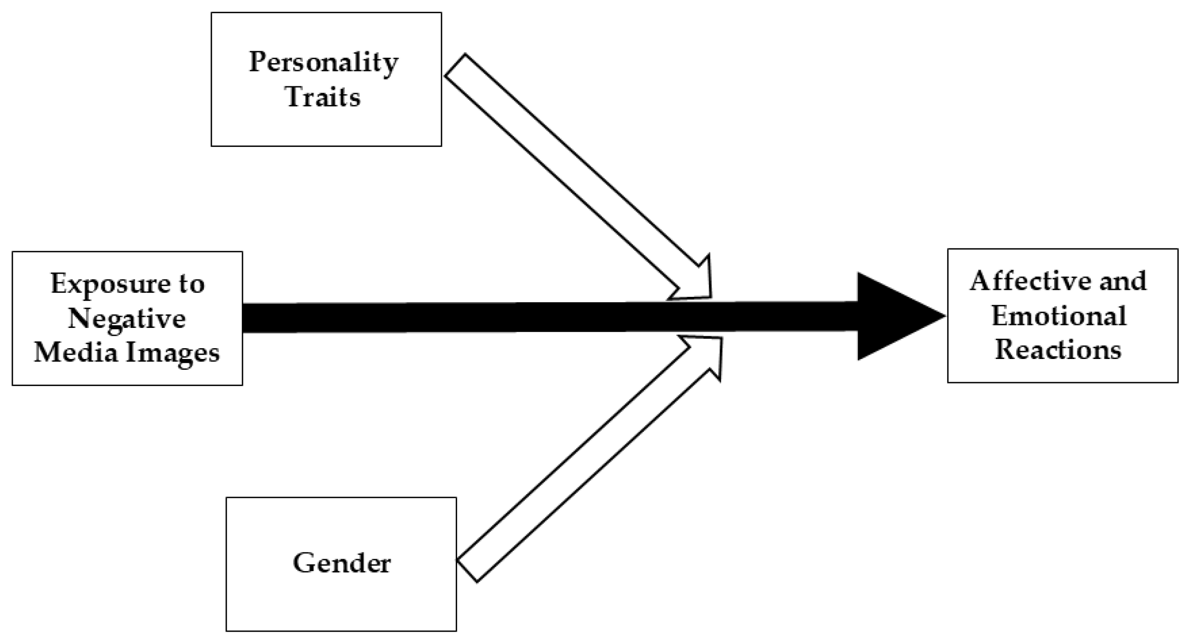 Similarly, we did not have clear a priori predictions about the moderating role that gender may play in our analyses. However, given the well-documented gender differences in emotional processing and expression—such as women’s generally greater emotional sensitivity and empathy (e.g., [62,63])—we included gender as a potential moderator in our analyses to explore whether the associations between personality traits and emotional responses to the different image types varied by gender. Figure 1 illustrates the proposed model examined in this study, highlighting how exposure to negative media images influences emotional and affective responses and identifying the moderating factors involved.