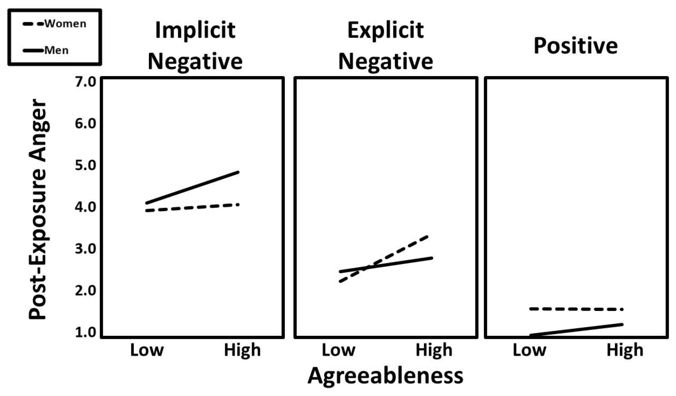 Agreeableness was expected to moderate emotional responses to the experimental conditions, such that individuals higher in agreeableness would exhibit stronger negative emotional reactions to both explicit and implicit negative scenes. This hypothesis is grounded in evidence linking agreeableness with compassion, empathy, and concern for others, suggesting that higher agreeableness may be associated with greater empathic distress in response to distressing or emotionally evocative content.