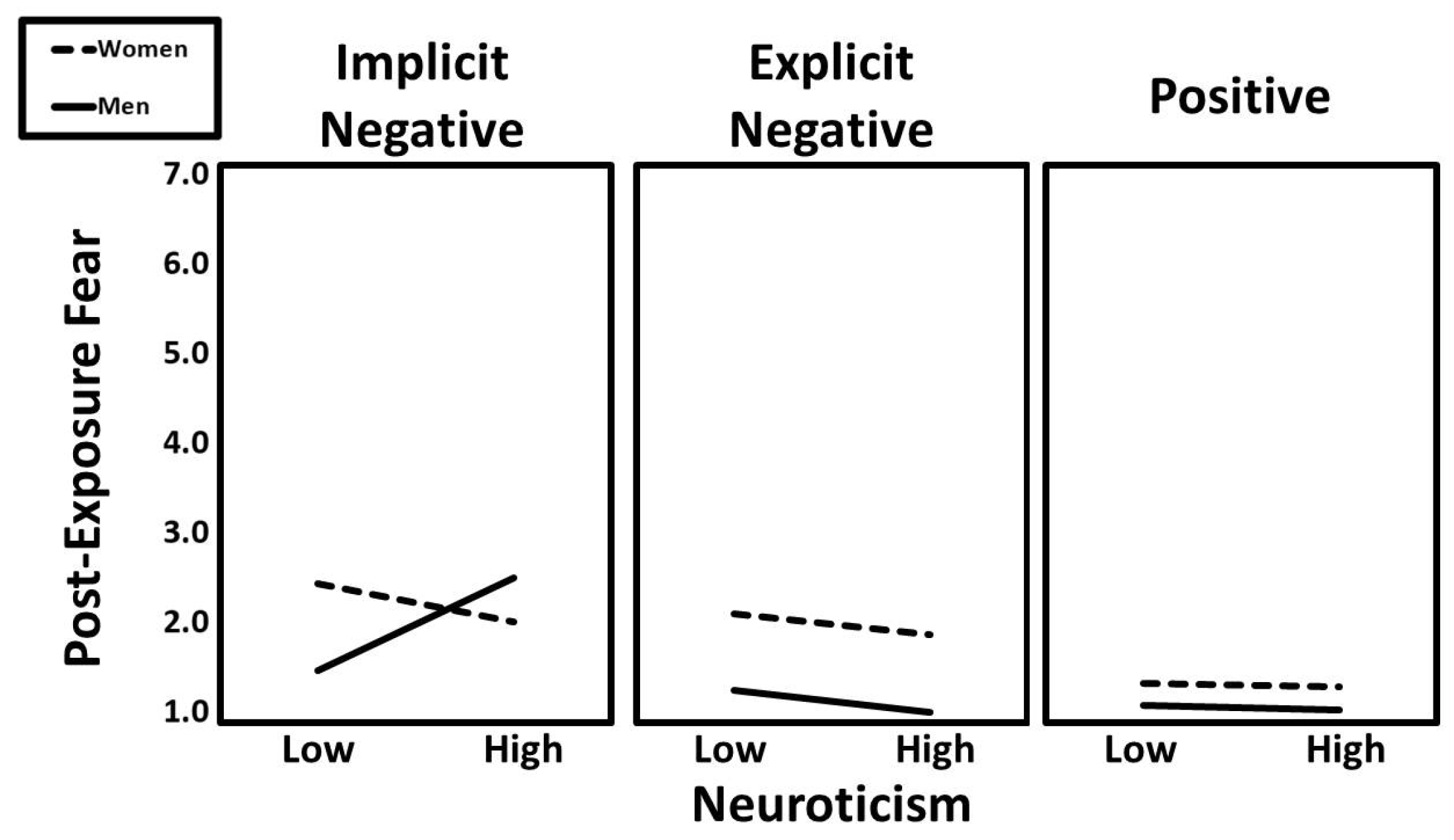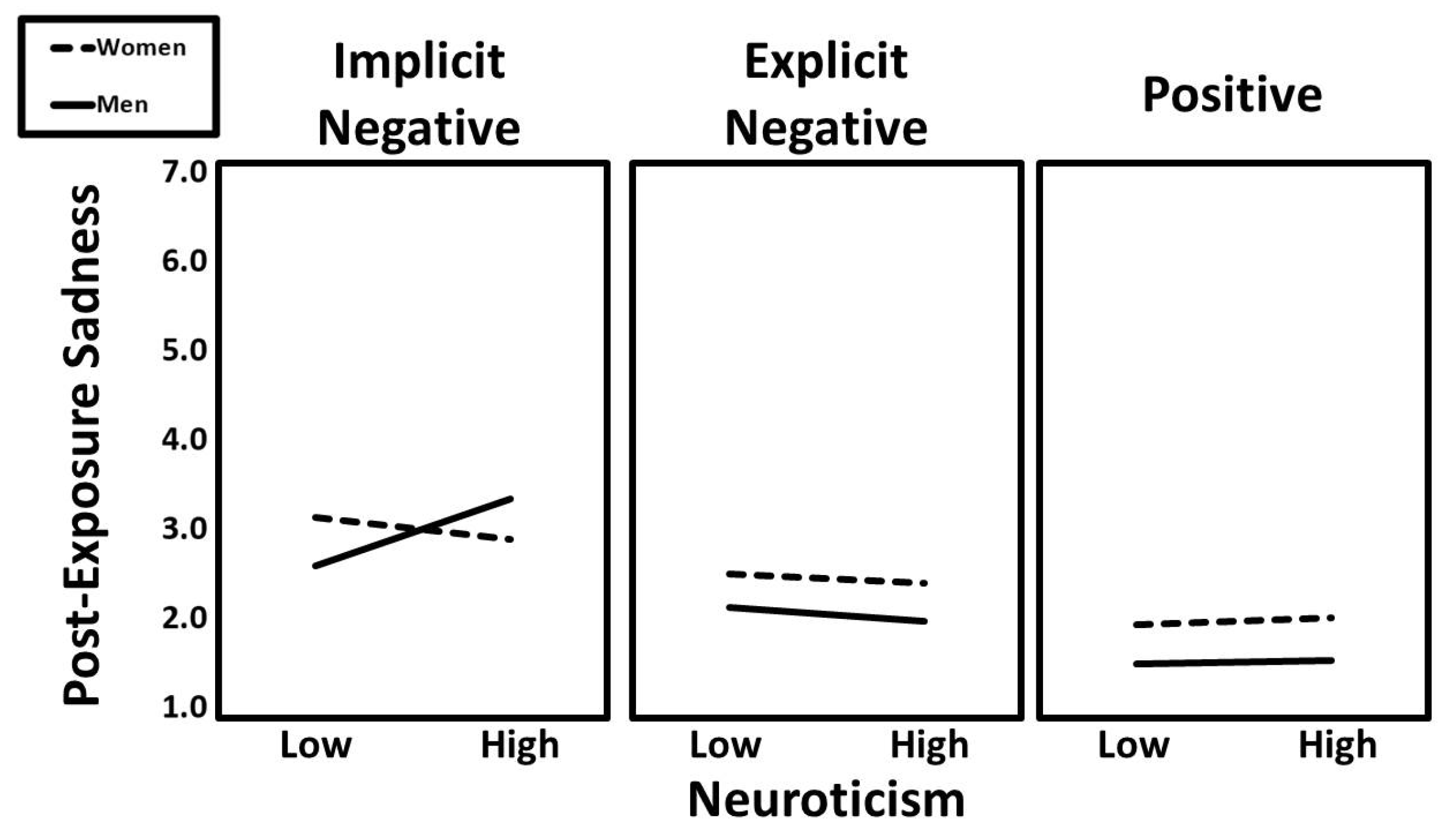 Neuroticism was expected to moderate emotional responses to the experimental conditions, such that higher levels of neuroticism will be associated with greater negative emotional reactions across all image types—particularly in response to explicit and implicit negative scenes. This hypothesis is based on evidence that individuals high in neuroticism are more sensitive to threat and tend to experience more intense negative affect in response to distressing stimuli, which we anticipate will be especially evident in the explicit and implicit negative conditions.
