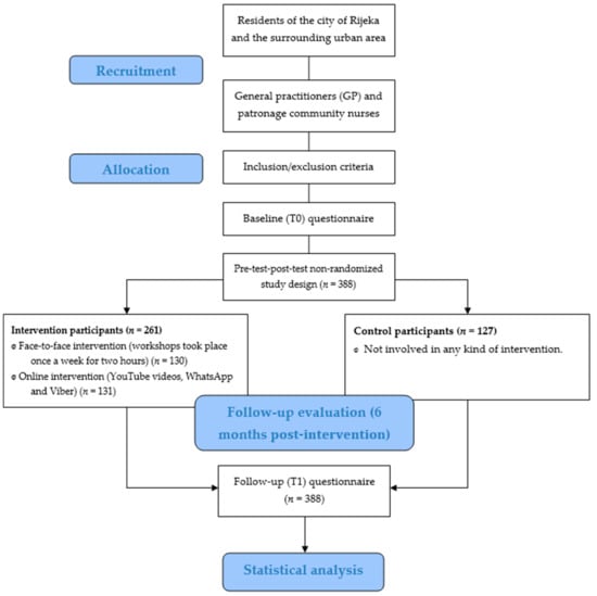 The participants were residents of the city of Rijeka and the surrounding urban area. Group allocation was determined by the geographical location of the participants and their general practitioners (GPs) or community patronage nurses. Patients who met the inclusion criteria were enrolled consecutively as they expressed interest upon arrival at the GPs or community patronage nurses (first come, first served), who informed them about the project, its activities, and the responsibilities associated with participation in the intervention or control group, until study group-specific targets were reached. A power analysis (two-sided α = 0.05, 80% power) targeting a moderate effect (Cohen’s d = 0.5) on the primary endpoint (change in HRQoL variables from baseline to post-intervention) for each active study group versus control indicated 104 completers per group, allowing for 20% attrition. We aimed to enroll approximately 130 participants per arm, which was achieved.