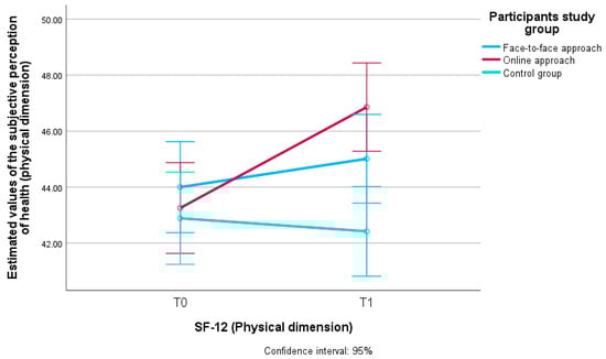 Table 3 shows that there are no significant differences in the reported levels of subjective HRQoL perception (physical dimension) between participants who participated in the face-to-face approach to public health interventions and the control group of participants between the first and second assessment time points, whereas there is a significant difference in the reported levels of subjective HRQoL perception (physical dimension) among participants in the online approach to interventions (p < 0.001). Accordingly, participants who attended the online workshop approach reported a higher level of subjective HRQoL perception (physical dimension) at the second measurement (T1) than at the first (T0) measurement.