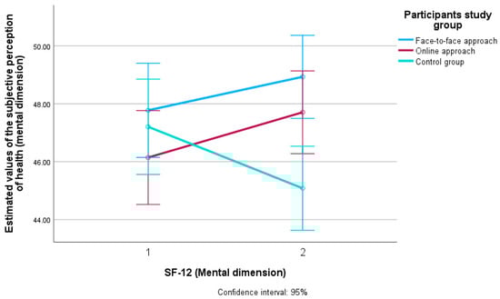 Table 5 shows that there are significant differences in the reported levels of subjective HRQoL perception (mental dimension) between the first and second measurement time points in the participants of the online intervention (p = 0.052) and in the participants of the control group (p = 0.009), while there are no significant differences in the participants of the face-to-face intervention (p = 0.151). Therefore, there were no significant changes in subjective HRQoL perception (mental dimension) between the first and second measurements for participants in the face-to-face approach, there was a significant increase in subjective HRQoL perception (mental dimension) for participants in the online approach to interventions, and there was a significant decrease in subjective HRQoL perception (mental dimension) for the control group of participants.