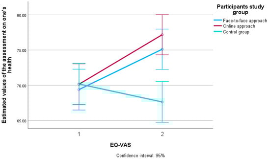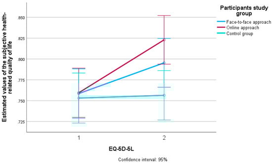 These results show a significant interaction effect of the change in the subjective assessment of HRQoL between the first and second measurement time point depending on the type of intervention [F (2, 385) = 4.977, p = 0.007, η2 = 0.025), which means that there are differences in the effect of time (subjective assessment of HRQoL between the two measurement time points) depending on the group affiliation (face-to-face approach, online approach and control group of participants). The effect size (η2 = 0.025) indicates that the effect of the independent variable on the dependent variable, i.e., the percentage of explained variance, is of a smaller magnitude.