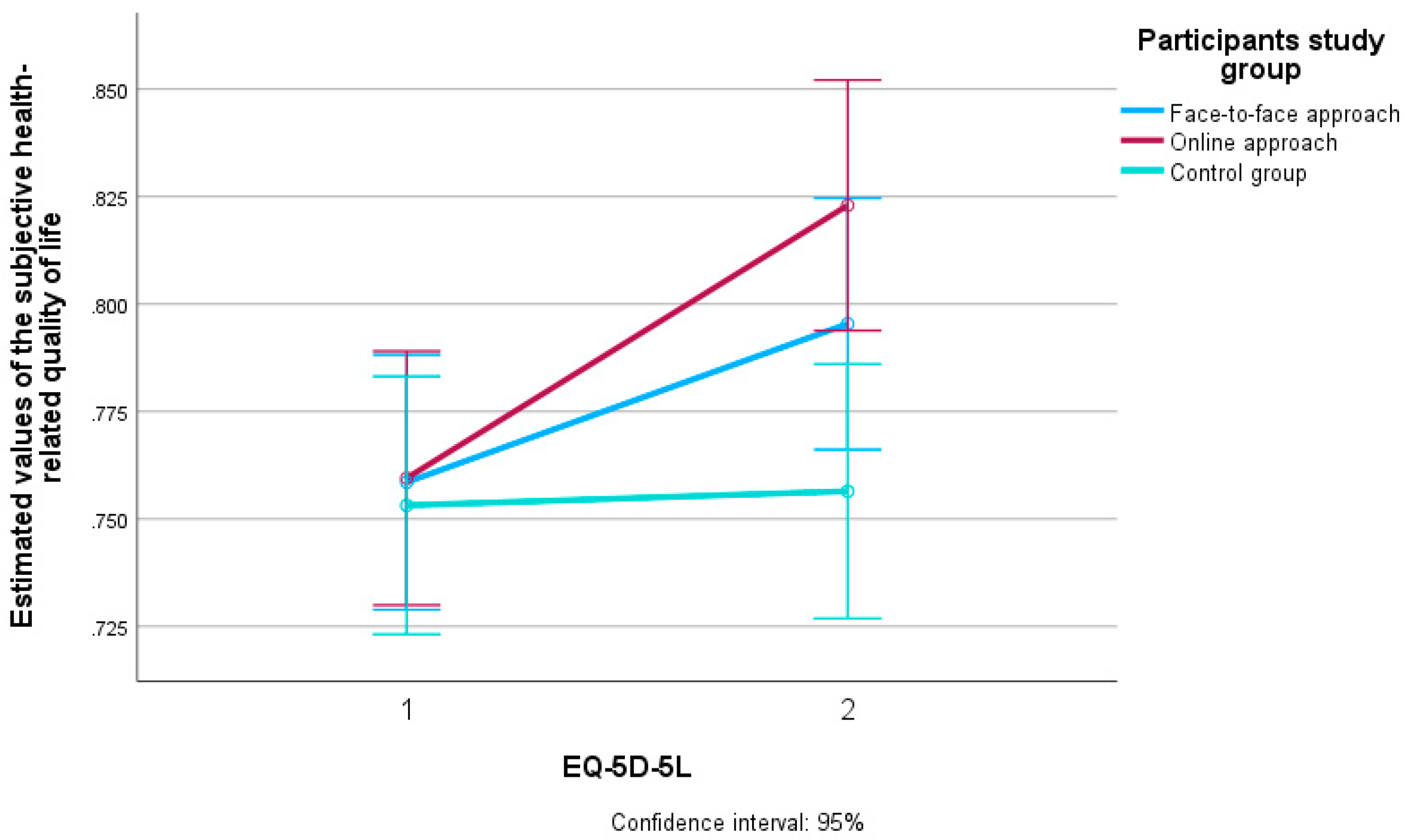 EQ-5D-5L x Group: face-to-face, online, control | 0.117 | 2 | 0.059 | 4.977 | 0.007 | 0.025 |