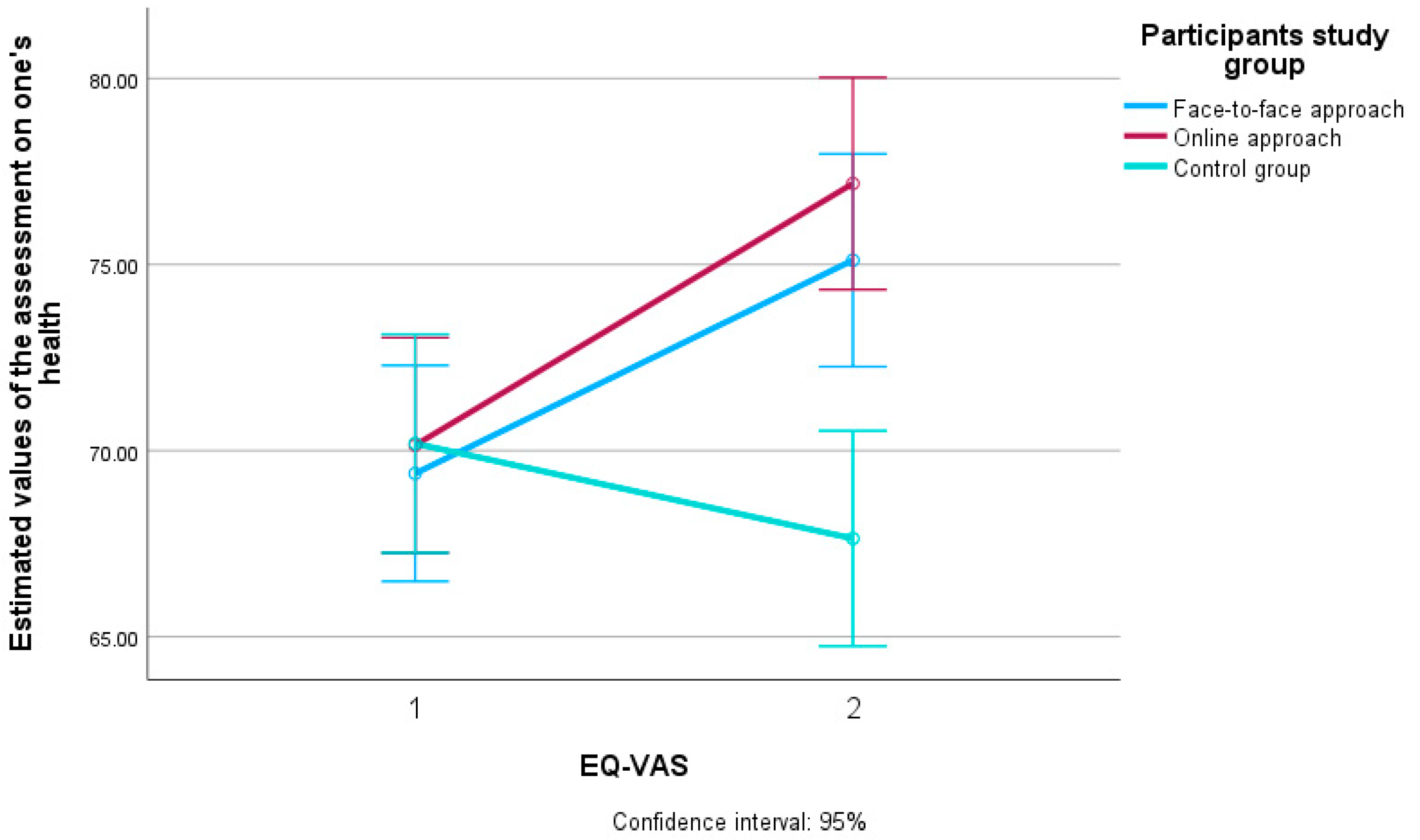 EQ-VAS x Group: face-to-face, online, control | 3464.734 | 2 | 1732.367 | 14.743 | <0.001 | 0.071 |