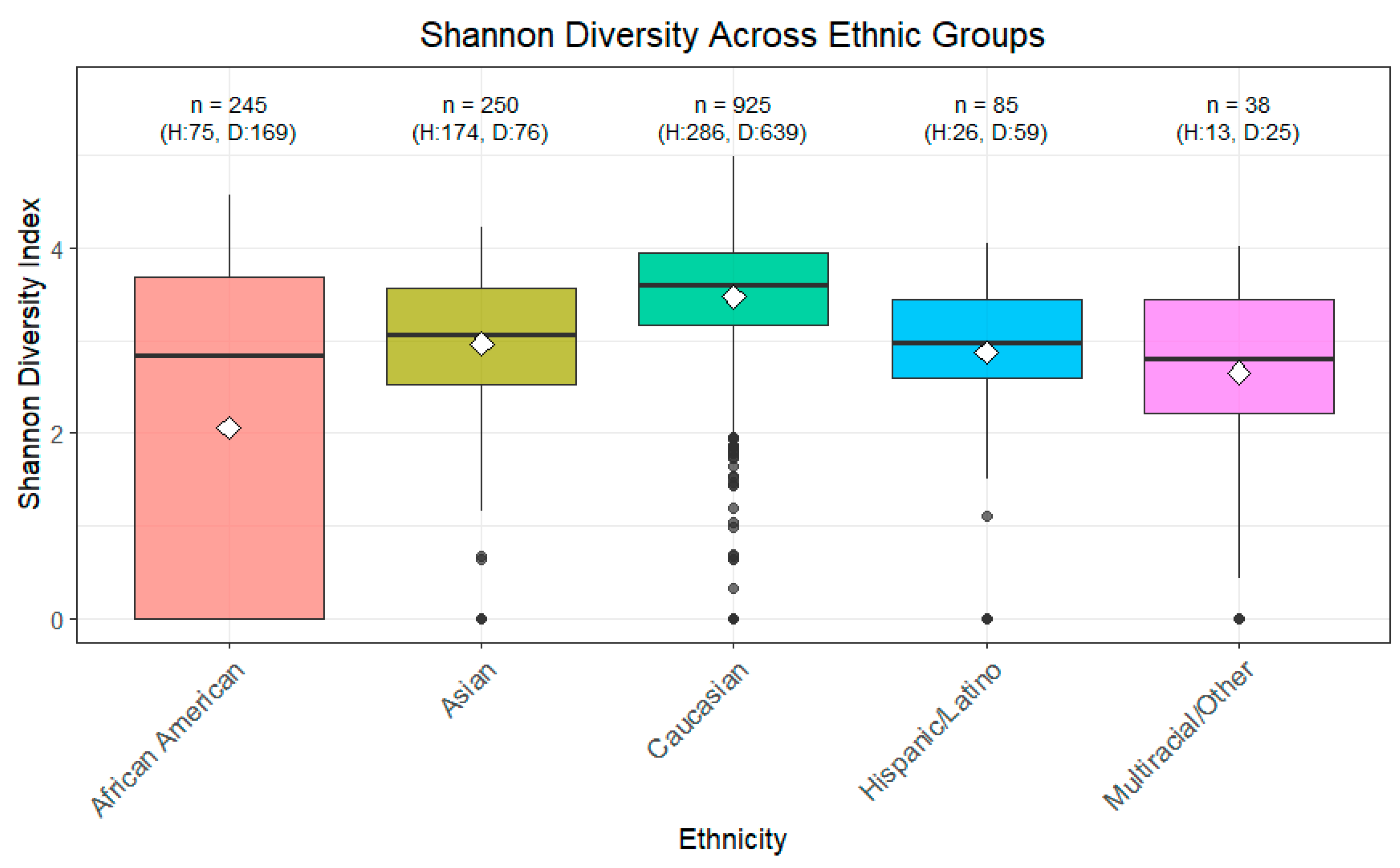 - Brooks, A.W.; Priya, S.; Blekhman, R.; Bordenstein, S.R. Gut Microbiota Diversity across Ethnicities in the United States. PLoS Biol. 2018, 16, e2006842. [Google Scholar] [CrossRef] [PubMed]