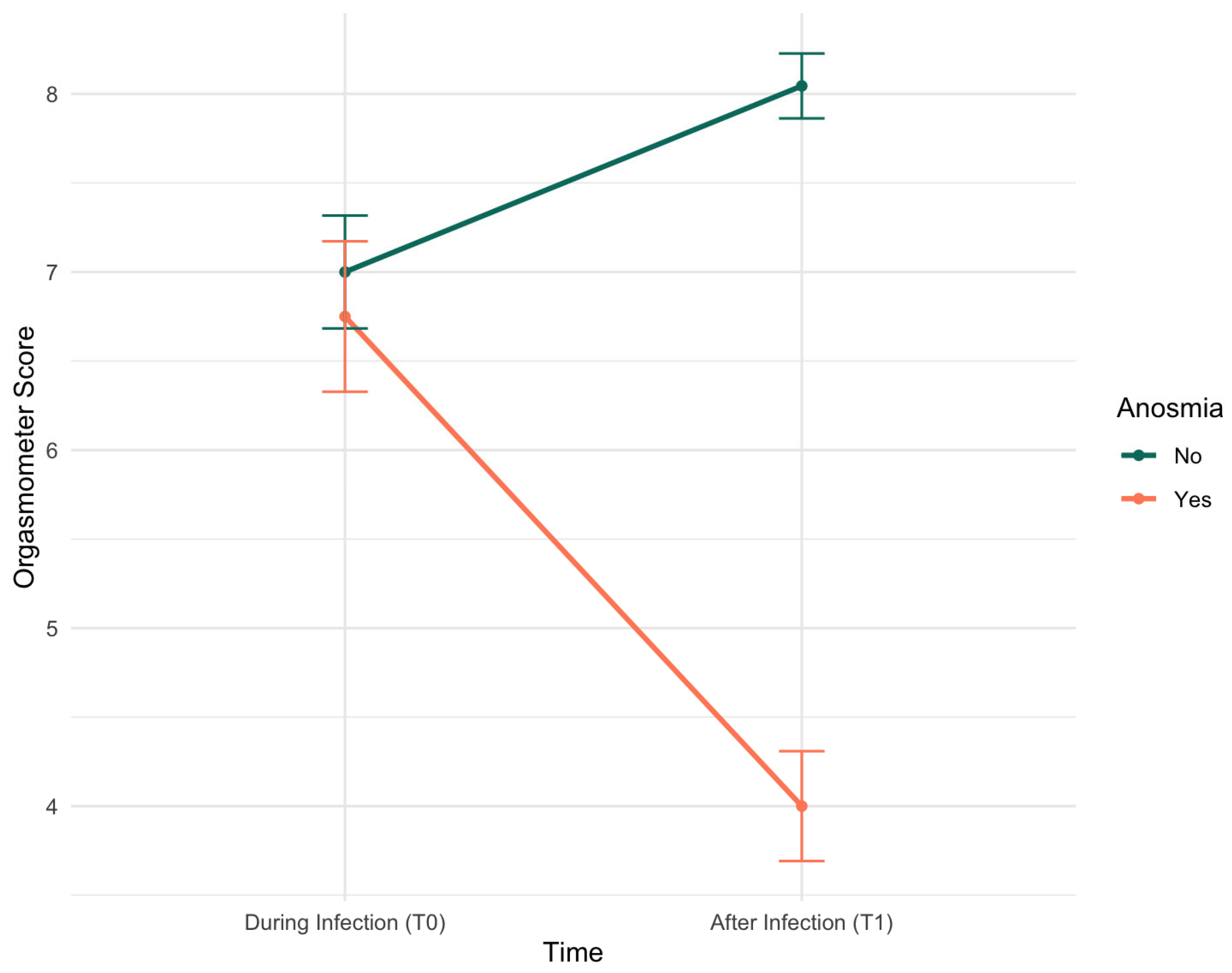 - To evaluate if the absence of smell (i.e., anosmia) had a role on the orgasmic experience by comparing subjects with COVID-19 anosmic symptoms and subjects without anosmia.