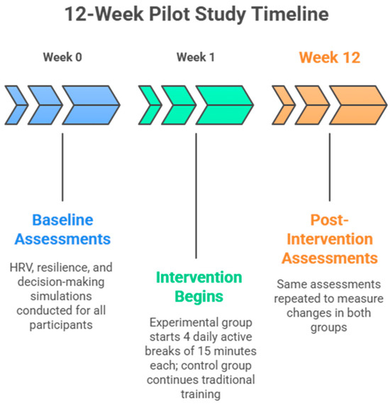 The control group, on the other hand, participates exclusively in the traditional training program without the integration of physical activity. During the entire study period, pre- and post-test assessments are carried out for each participant, including HRV monitoring, psychological assessments (such as the Resilience Questionnaire) and decision-making simulations. Psychological and physiological assessments are administered at the beginning of the study and at the end of the 12-week program.